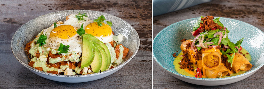 Other entrées include Potato Flautas and Lamplight Chilaquiles. The Potato Flautas are made with plant-based chorizo, vegan piquillo crema, serrano-tomatillo salsa, arugula salad, and escabèche. Our one-of-a-kind Lamplight Chilaquiles feature house-made tortilla chips with cheddar-jack cheese, two eggs, queso fresco, red onions, cilantro-serrano sour cream, and sliced avocado, topped with a 3-chile red sauce and pepitas.