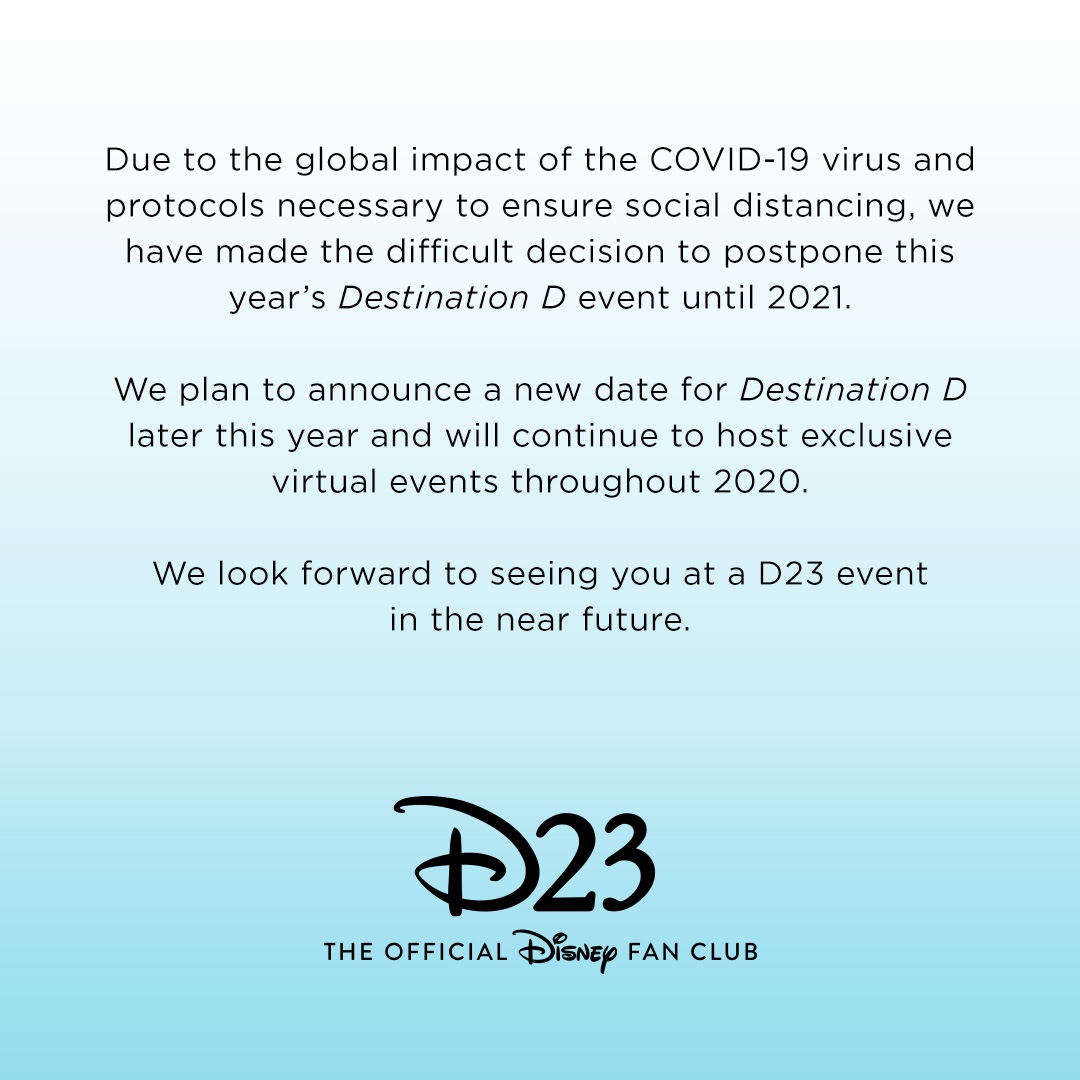 D23 has announced that they are postponing their “Destination D: Fantastic Worlds” event at Walt Disney World will be postponed until 2021, although a date has not been decided on.