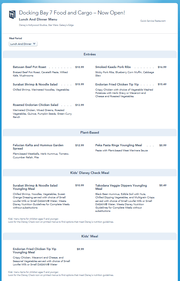Today, Disney has once again altered the names of menu items at Docking Bay 7 on Batuu creating hybrid names that feature both Star Wars themed names and popular "off-world" names for various dishes. Take a look: