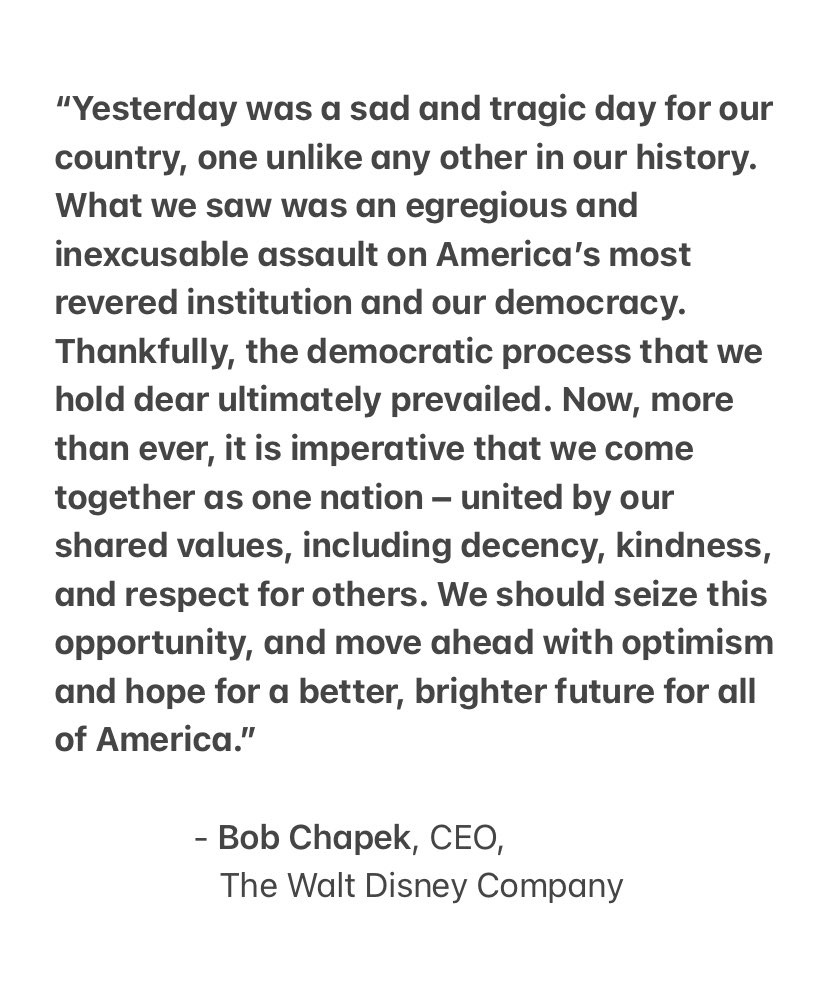 Disney CEO Bob Chapek issued a statement tonight following President Donald Trump’s speech in which he recognized “a new administration” coming into The White House on January 20th.