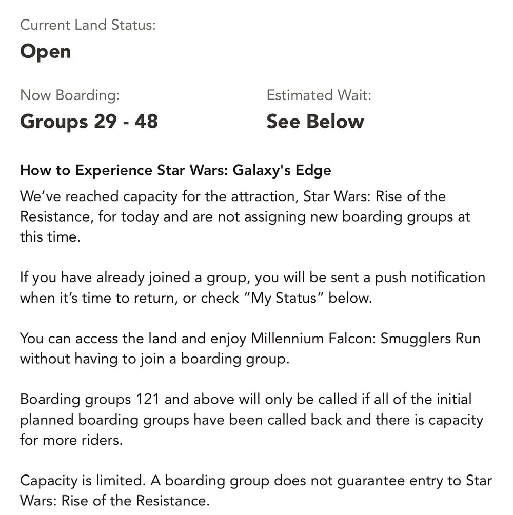 As seen above on the MY DISNEY EXPERIENCE app, after all boarding groups 1-120 have reached capacity for the day and been called, Guests will have the opportunity to join backup boarding groups if there is additional capacity for more riders to experience Rise of the Resistance. Of courses, capacity is always limited, and joining a boarding group does not guarantee entry to the attraction. But any extra chance to join the Resistance will certainly be welcomed by the thousands of Guests that visit Walt Disney World and Star Wars: Galaxy's Edge this holiday season!