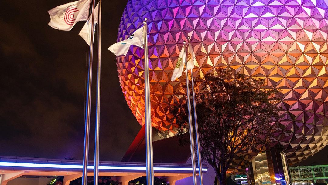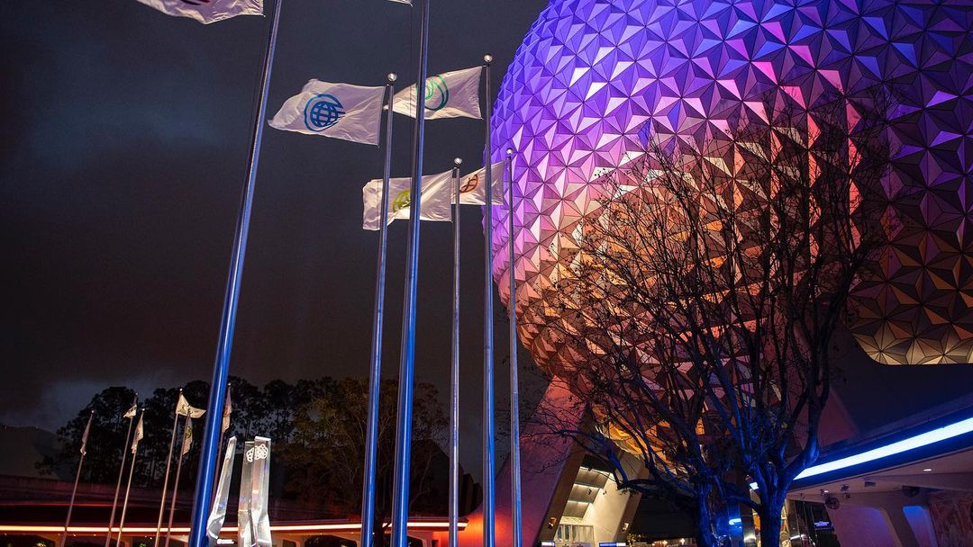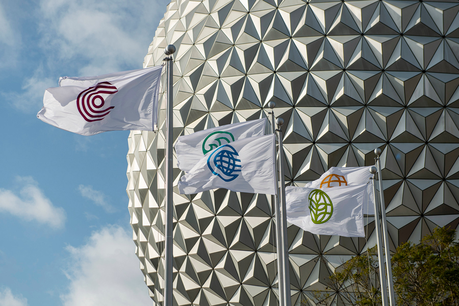 "Today our @WaltDisneyImagineering EPCOT project team raised flags featuring six original EPCOT icons on 12 new flagpoles flanking Spaceship Earth as we celebrate finishing touches at the new entrance plaza. These icons go back to the original design philosophy of the park and represent pavilions and attractions in a vibrant new palette that is inspired by the new EPCOT neighborhoods.