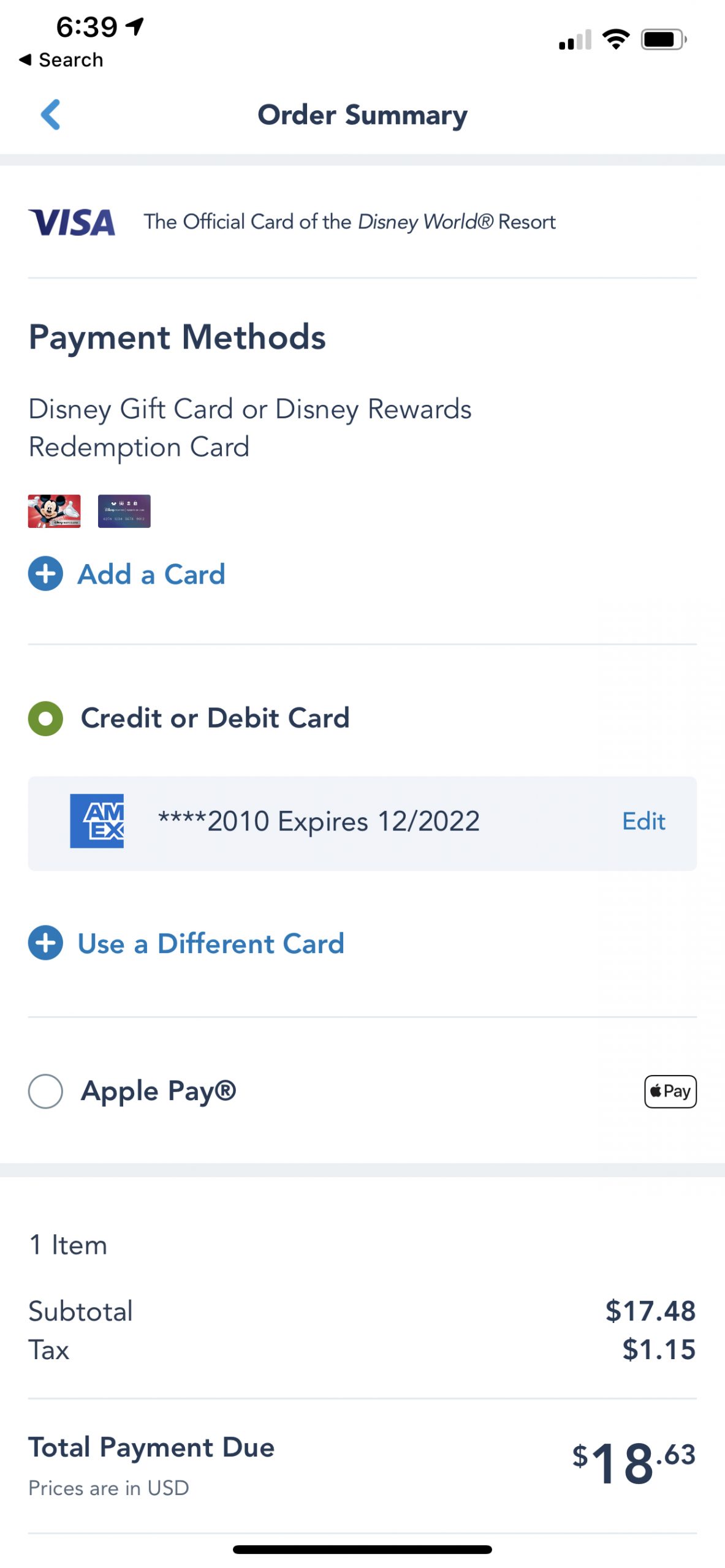 The ability to use Apple Pay is rather prominent, appearing before guests reach the checkout page that allows for the use of regular credit cards, gift cards, and Disney Reward Redemption.
