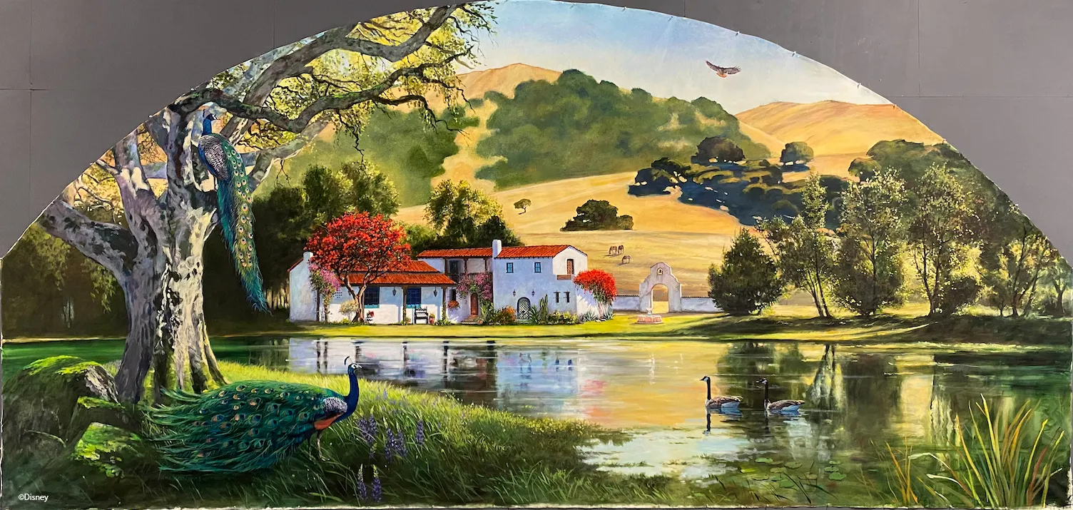 The space will also feature a lovely mural by Imagineer Leslee Turnbull, who also painted murals for some other exclusive Disneyland spaces.