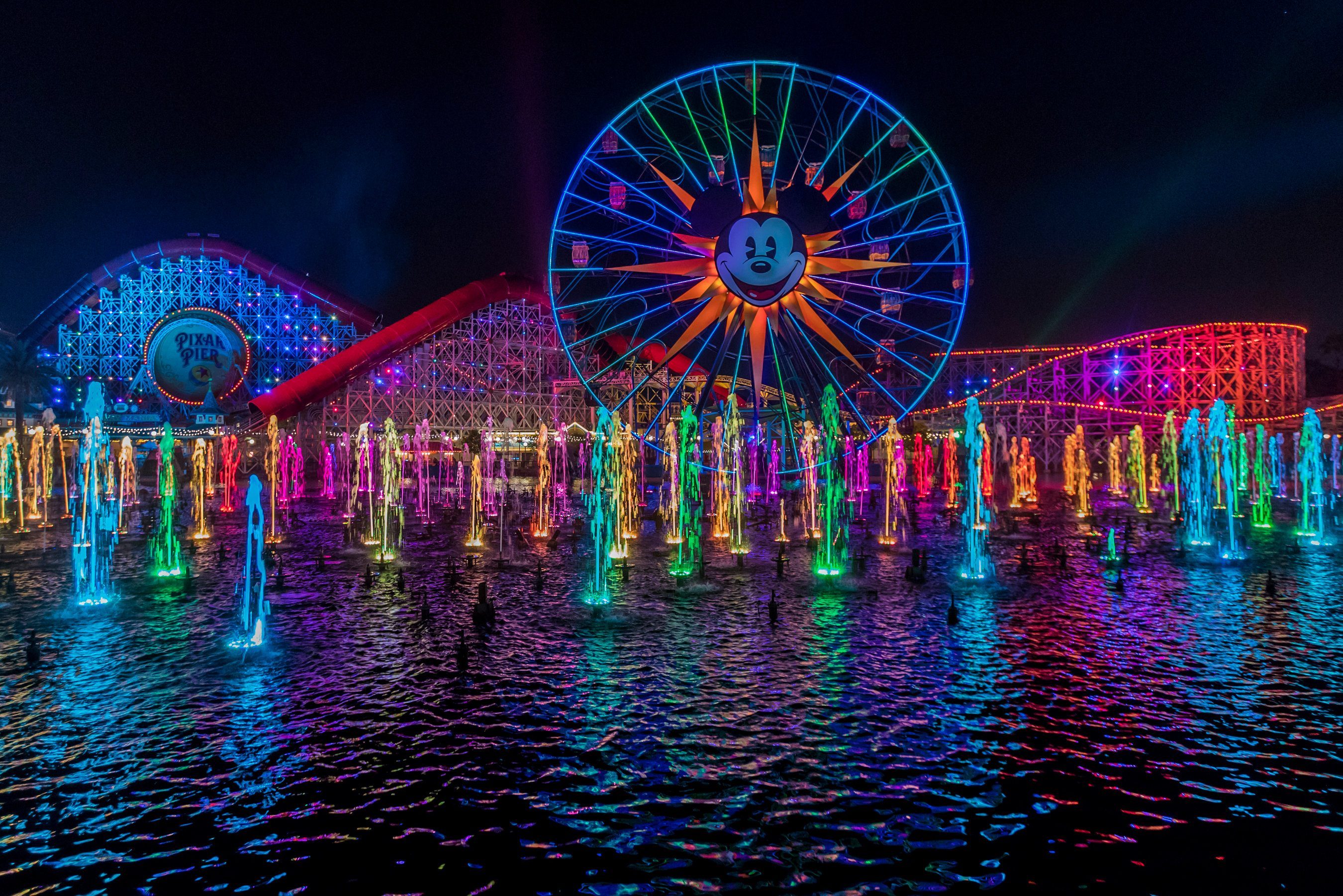 “World of Color” at Disney California Adventure brings animation to life with powerful fountains that create an immense screen of water. Combining music, fire, fog and laser effects with memorable animated sequences, “World of Color” floods the senses and immerses audiences in some favorite Disney and Pixar stories, including scenes like WALL-E and Eve zipping through the cosmos, Pocahontas exploring just around the riverbend and Jack Sparrow battling on the sea. The mega-scale spectacular is presented on a massive “stage” of water, color and light that is bigger than a football field and encompasses all of Paradise Bay. Plus, the powerful fountains can send water to heights ranging from 30 feet to 200 feet – higher than the top of Pixar Pal-A-Round!
