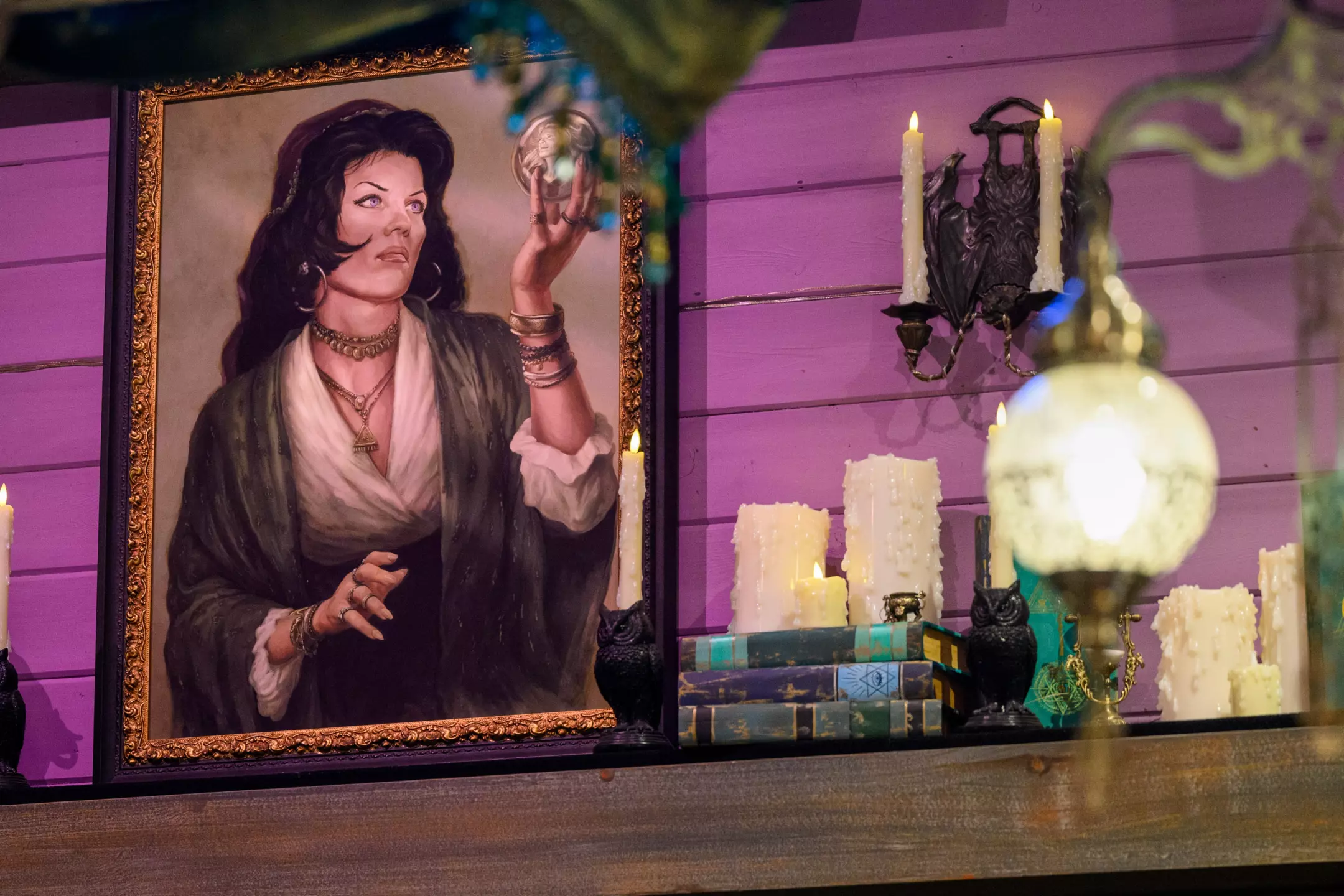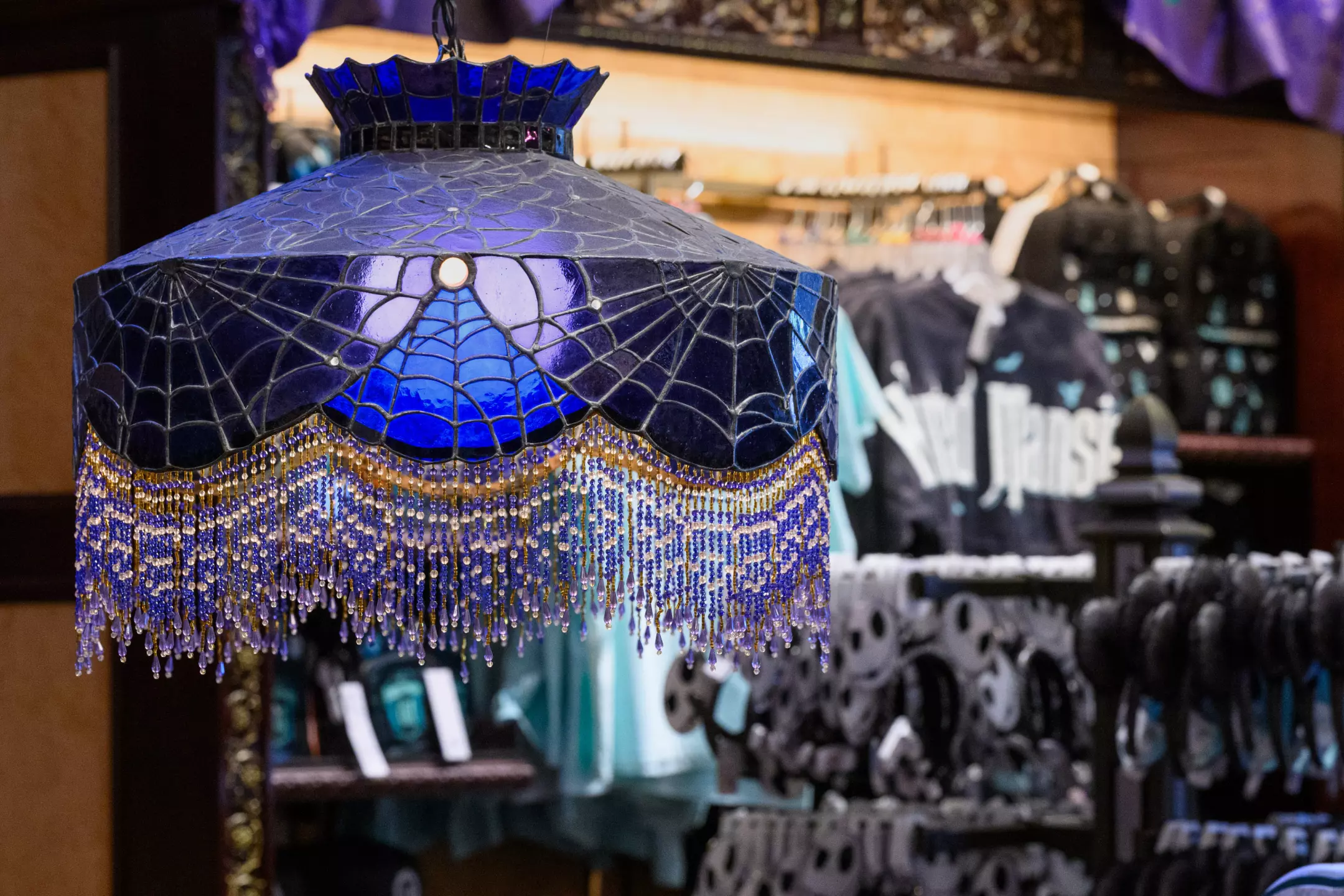 The shop features numerous connections to the attraction's history, including a chandelier that once hung inside the mansion itself. "We made this in the early '80s to go over the crystal ball before it floated," Irvine says, describing the spider web-inspired fixture that was relocated during previous updates.