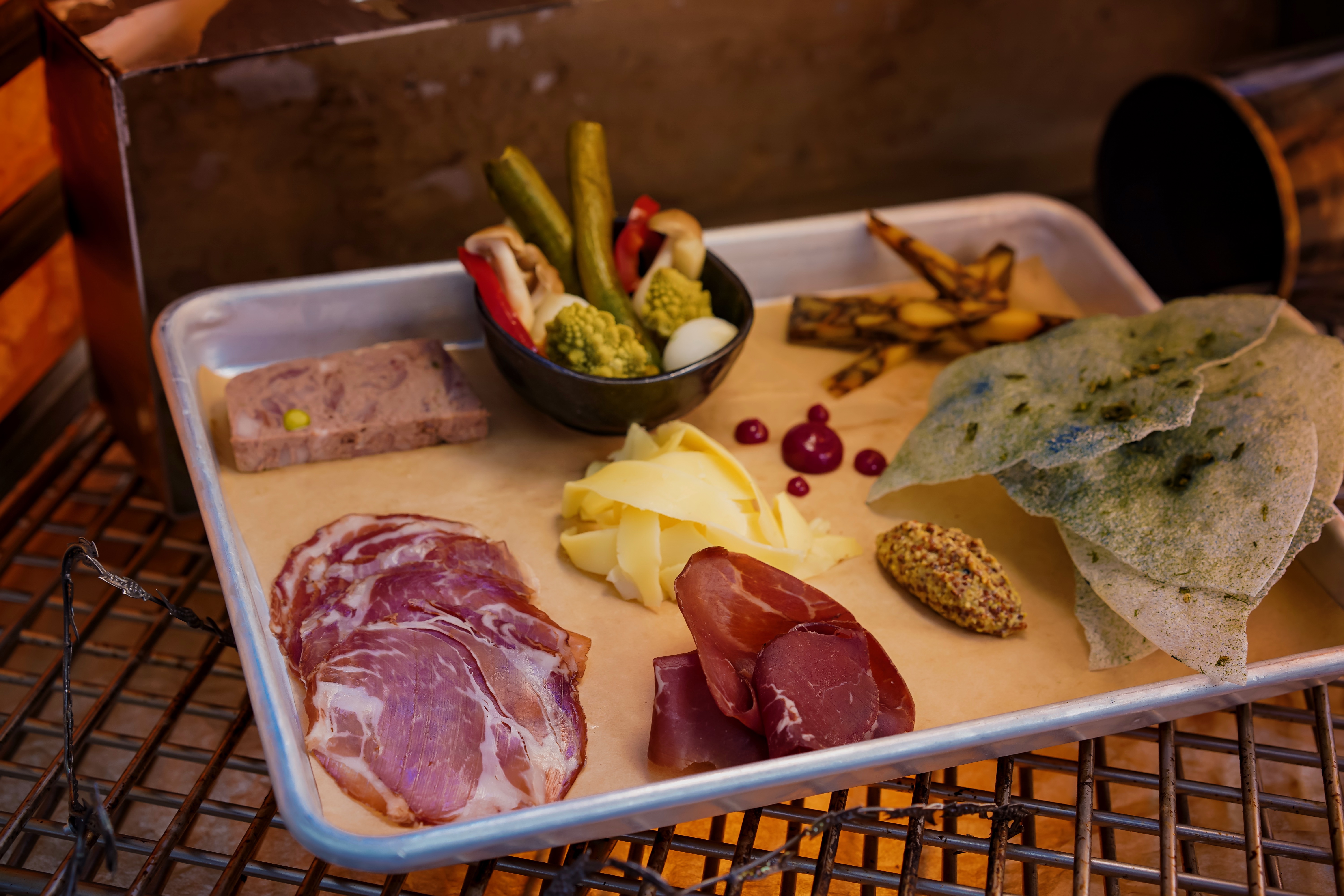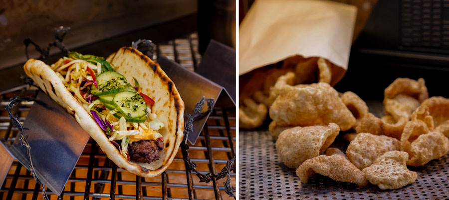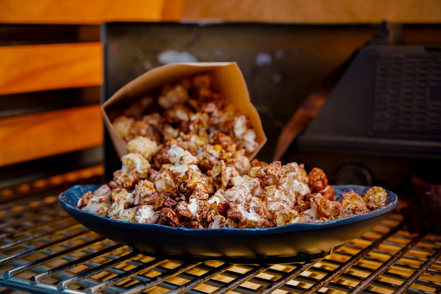 Disneyland's newest land will also add five new exclusive food options to its menus on October 16. At Oga's Cantina, the Happabore Sampler will treat Guests to a selection of meats, cheeses, condiments and crackers. Docking Bay 7's menu will now include a plant-based kids' meal option, the Garden Patty Bun, which includes a bao bun, roasted carrots, house sauce and an orange. Ronto's Roasters will also offer a plant-based item, the Ronto-less Garden Wrap, which is a plant-based sausage topped with spicy kimchi slaw, sweet-pickled cucumber and Gochujang spread. Also added to the fare at Ronto's Roasters will be Kryrll Pork Rinds with cinnamon sugar, served in a MSE-6 Series Repair Droid souvenir popcorn bucket. Finally, Kat Saka's Kettle will have a chocolate popcorn with Crait Red Salt available for snack-seeking visitors to Batuu.