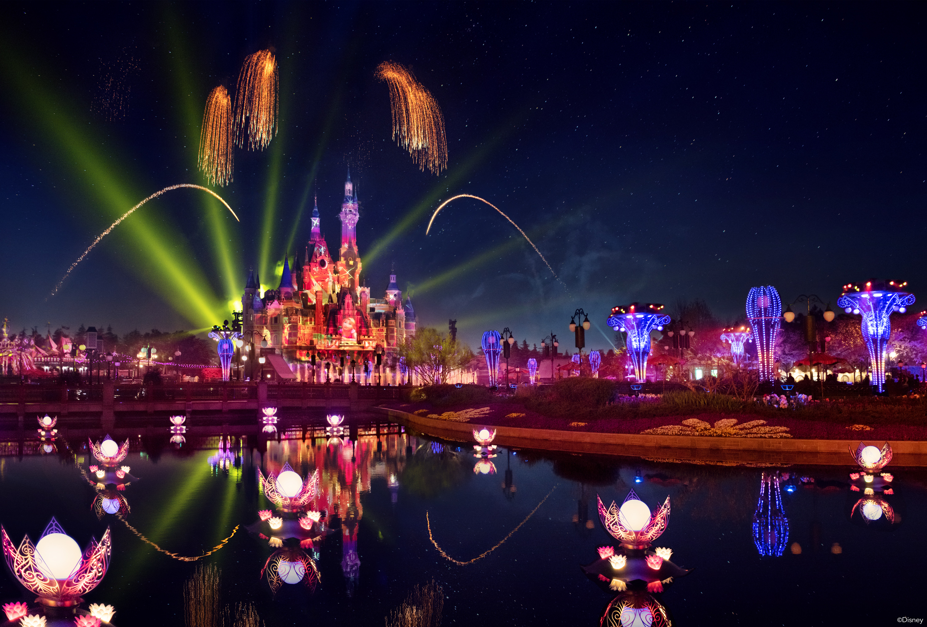 To create this incredible immersive effect, 91 lighting fixtures, including eight giant new towers, 11 enhanced garden arbors, and 12 electronic lily pads have been installed across 15 new locations throughout the park. 22,000 new LED lights have been installed onto the new towers and arbors, adding to the 5,000 lights that were already in the garden, totaling 27,000 points of light for the new show. The lighting effect also leverages synchronized lighting from the Dumbo the Flying Elephant and Fantasia Carousel attractions, as well as the parade route to further enhance the experience. A grand water display will also be presented in front of the castle, employing 38 static fountains, seven moving fountains, and one water screen, while 27 fire burst locations and six lasers installed around the castle will add pyrotechnic and lighting elements to this stunning audio-visual experience.