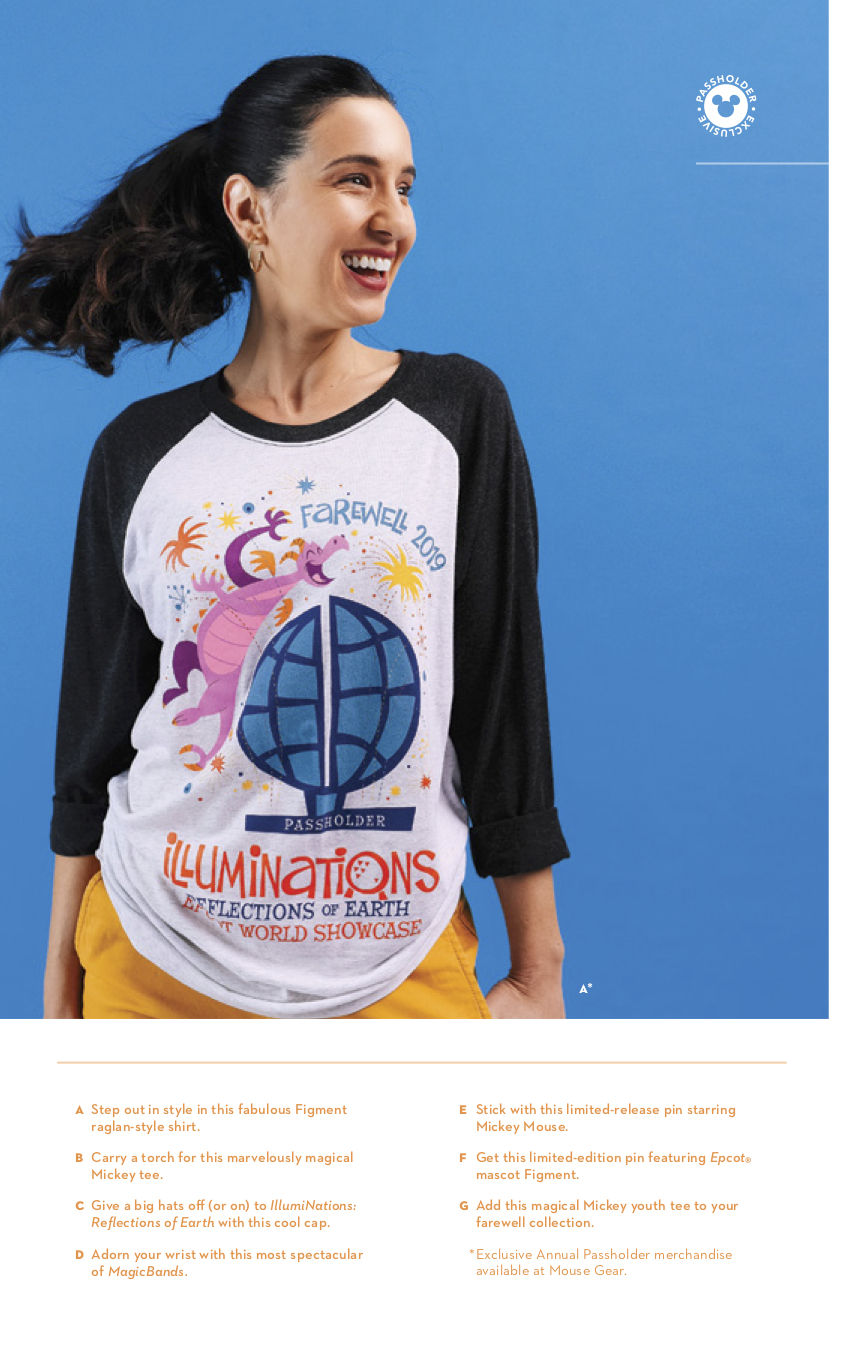 Exclusively for Passholders, the raglan-style T-shirt features Figment, and a "Farewell 2019" wish to Illuminations: Reflections of Earth.