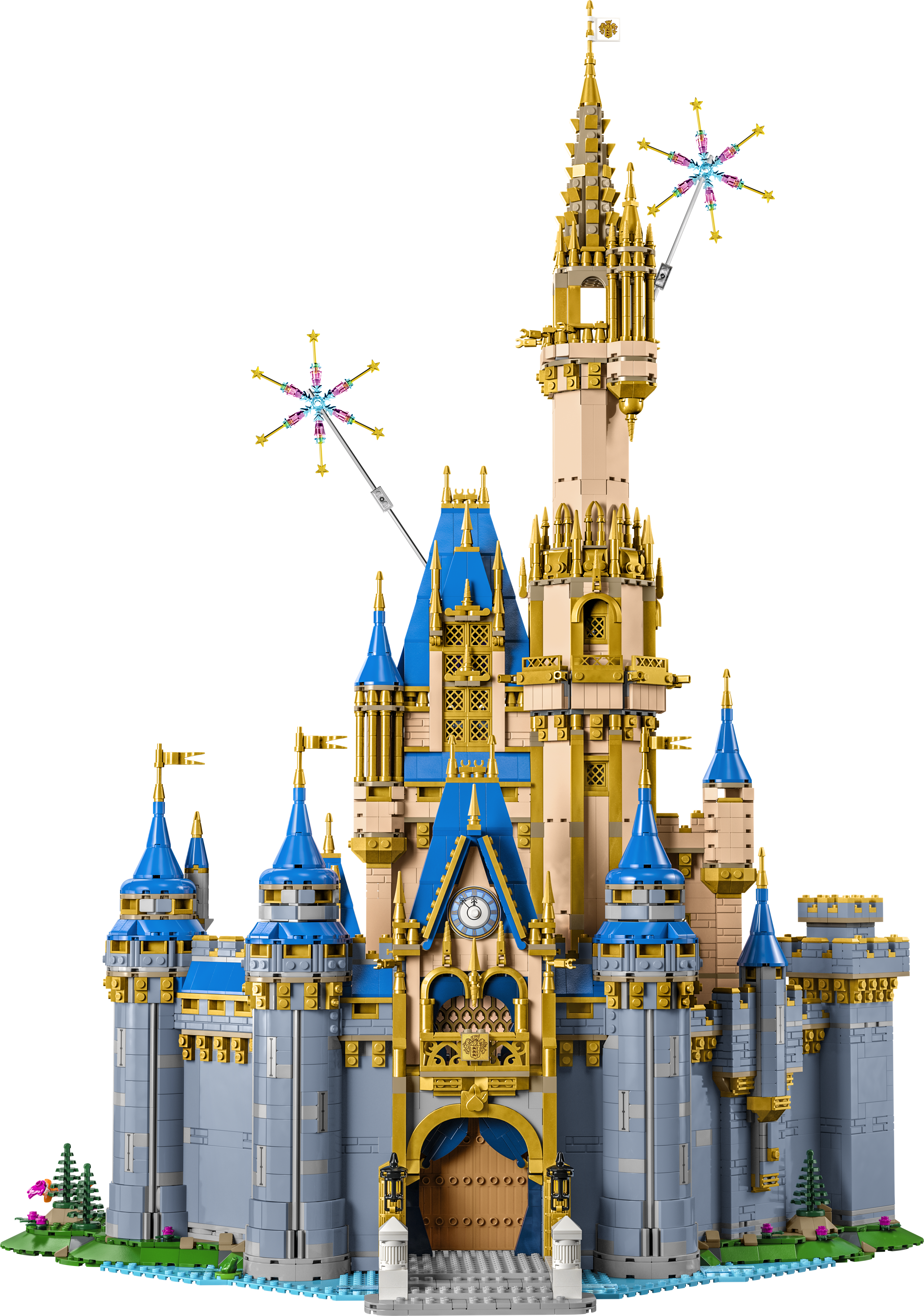 Embellishing the exterior of the castle are dazzling fireworks, further adding to the magical atmosphere. The set includes eight minifigures, representing various Disney Princess characters and their male counterparts, who can be positioned throughout the castle, adding a touch of authenticity to the play experience.
