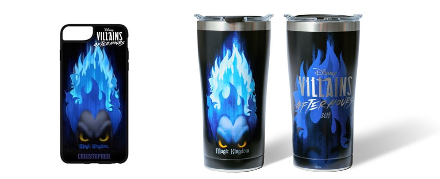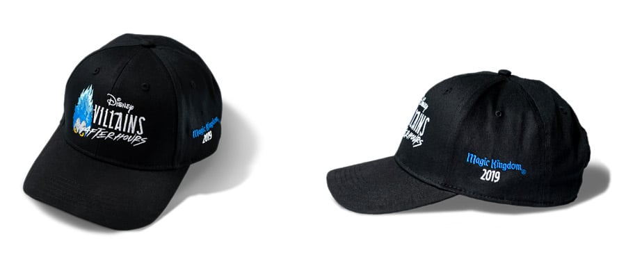 Hades is featured on both T-shirts and tanks, as well as on baseball caps, with his flaming blue hair encompassing the silhouettes of some of the Disney villains on the shirts and taking on the form of Cinderella's Castle on the caps' logo. Both shirts and caps commemorate this summer's event with the 'Magic Kingdom 2019' tag line :