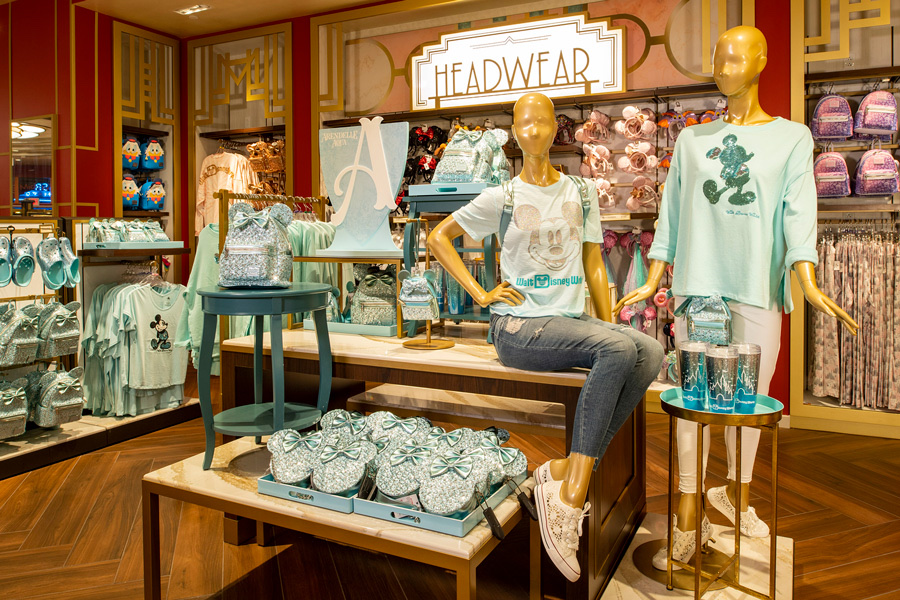 Travel back in time and experience the transformative art deco décor within the store. If you look up at the ceiling, you can find a stylish scheme of squares and gold accents that create a glamorous atmosphere. Arendelle Aqua and Halloween merchandise can be found at this location right now.