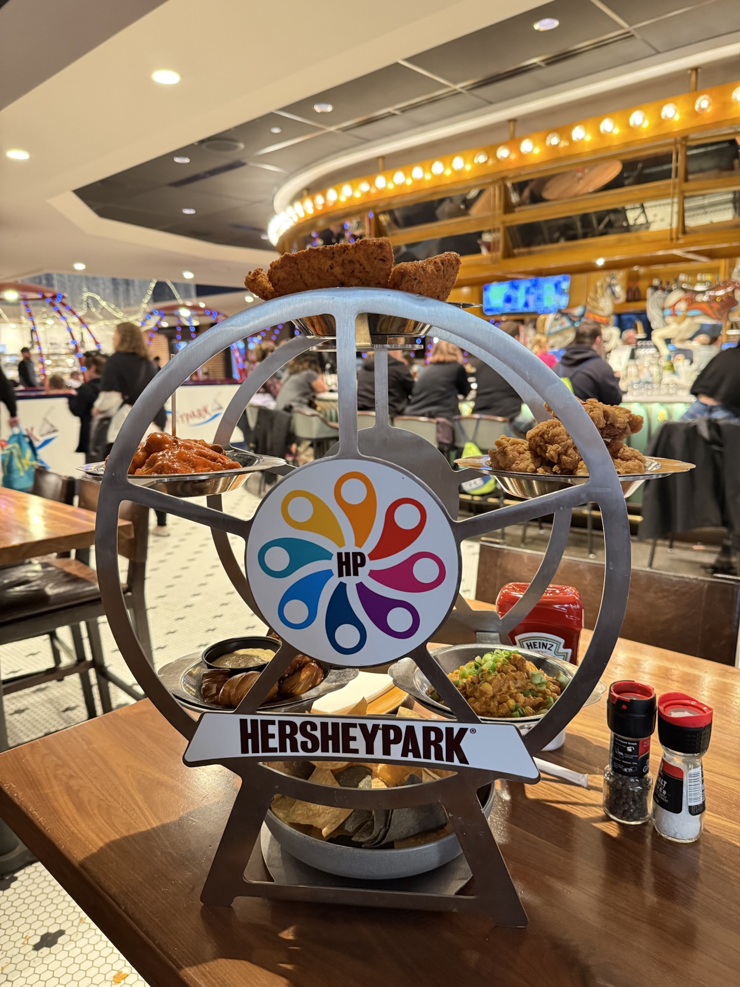 Finally, I dined at the park’s signature restaurant, The Chocolatier, which is truly a great time! You don’t even need a park ticket to dine there, and it’s open year-round, even on days the park is closed (alongside Milton’s Ice Cream Parlor and The Sweeterie Confectionery Kitchen, which are both amazing). Aside from the desserts, which are over the top but heavy on milkshakes, is the Ferris Wheel Sampler, which includes Hershey's Chocolate Barbecue Chicken Wings, Crispy Mozzarella, Classic Chicken Tenders, Cheesy Corn Dip, Soft Pretzel Dippers, all served riding on a giant Ferris Wheel that is brought to your table. It’s so much fun and is more than enough for a meal (at least for my party of one).