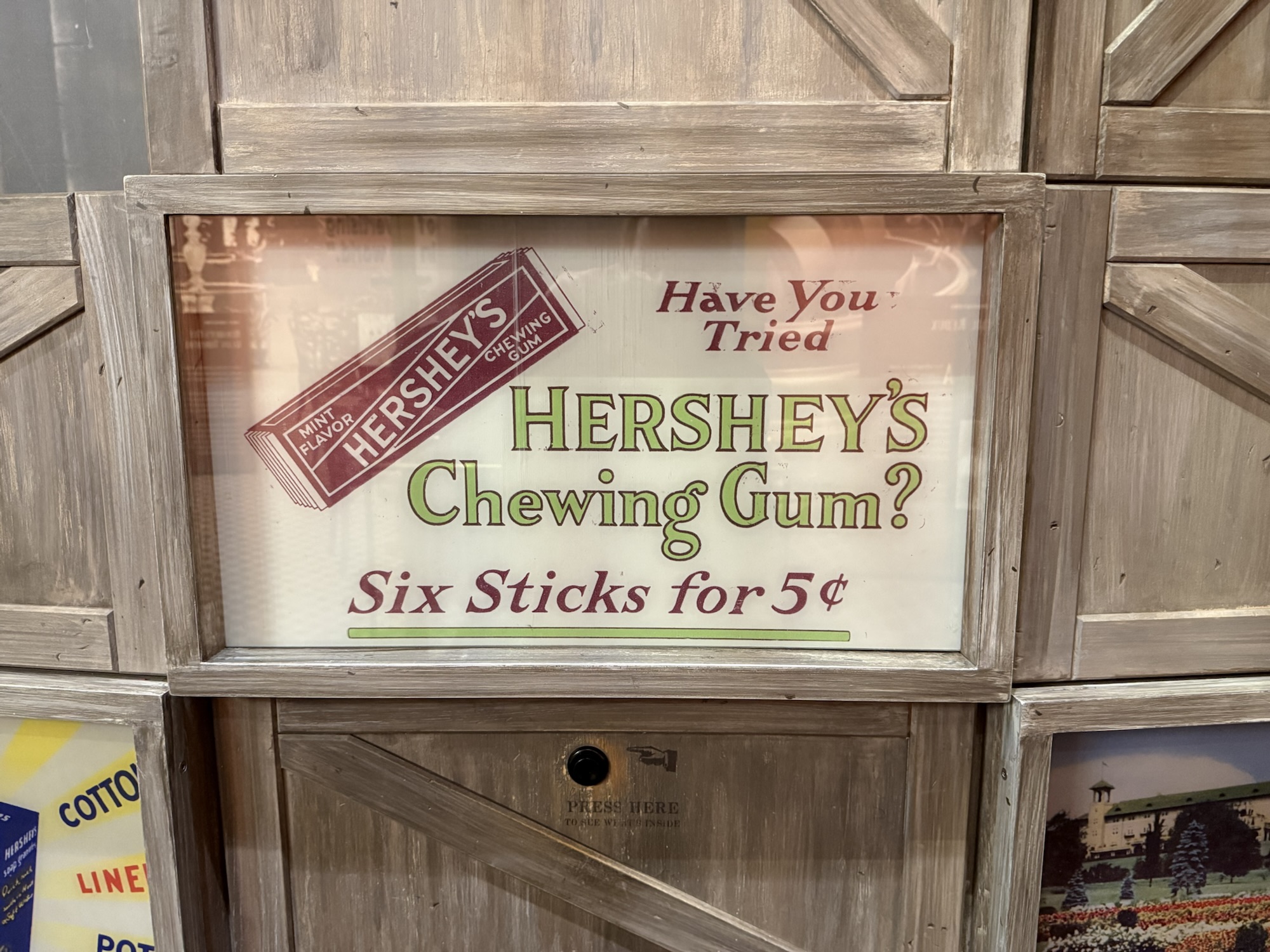 The exhibit space is split between Milton Hershey’s life and philanthropic work, the history of the Hershey Chocolate Company, and the town he created. As someone whose knowledge of Hershey and its founder extended little beyond the marketing blurb and the bits and pieces I’ve picked up over the years from my father who grew up in Hershey, I found the museum fascinating, especially the timeline that included various discounted products. Did you know Hershey made branded gum? I didn’t.