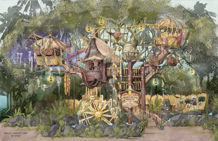While paying tribute to the original 1962 Treehouse based on the movie Swiss Family Robinson, the new Adventureland Treehouse introduces a fresh storyline for a new generation. Throughout the multi-level treehouse, guests will discover rooms belonging to each family member that reflect their skills, talents, and interests.