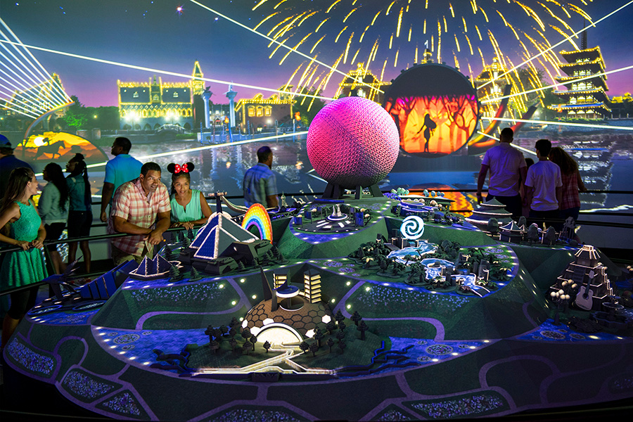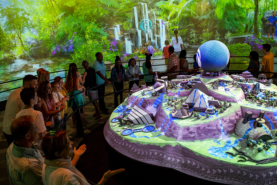 Inside, you’re surrounded by a seamless, 360-degree, floor-to-ceiling screen showing a continuous 12-minute film with vignettes about new experiences coming to the park. All the while, a three-dimensional artfully designed model in the center of the room appears to change in time with the film, as projection-mapping technology highlights different areas of the park in special ways.