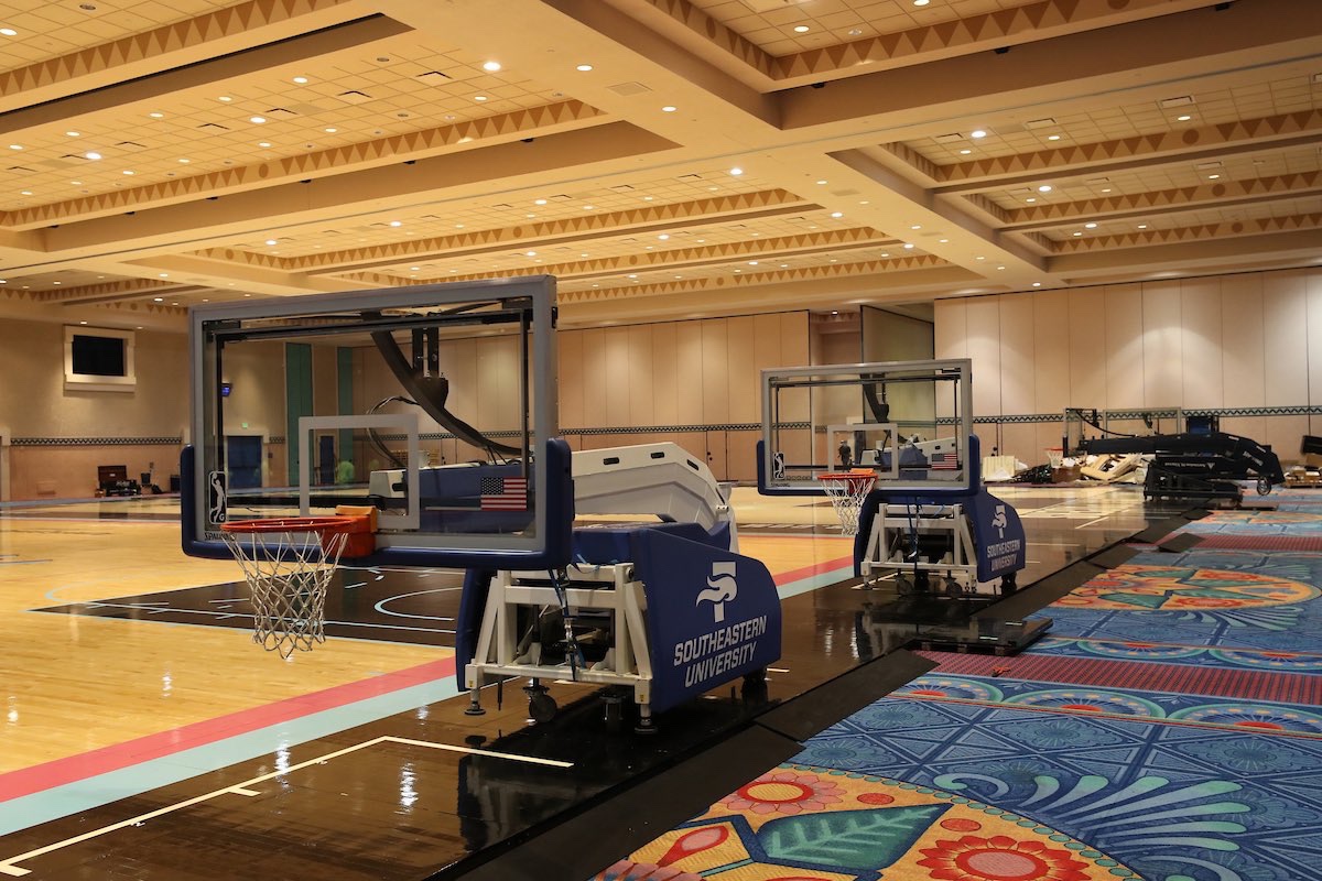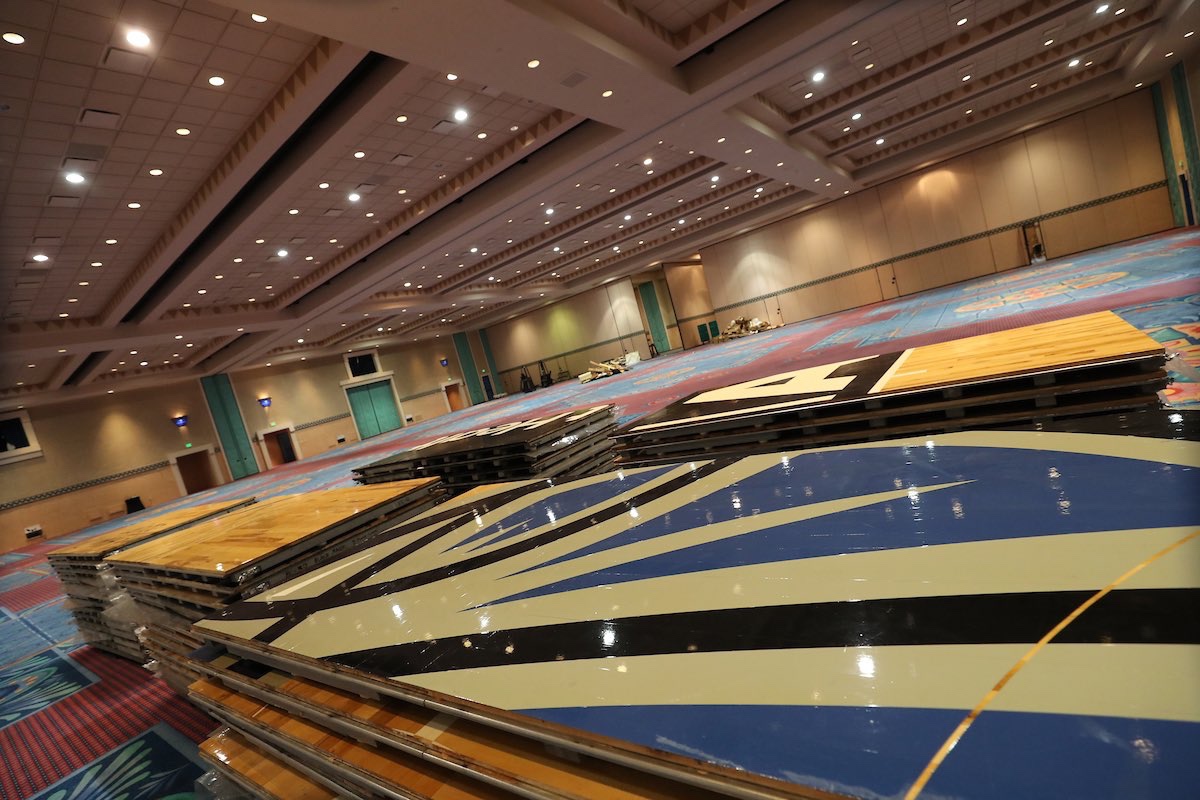 Custom NBA flooring for the practice courts is being laid inside the convention center at the Resort, as seen in the photos below: