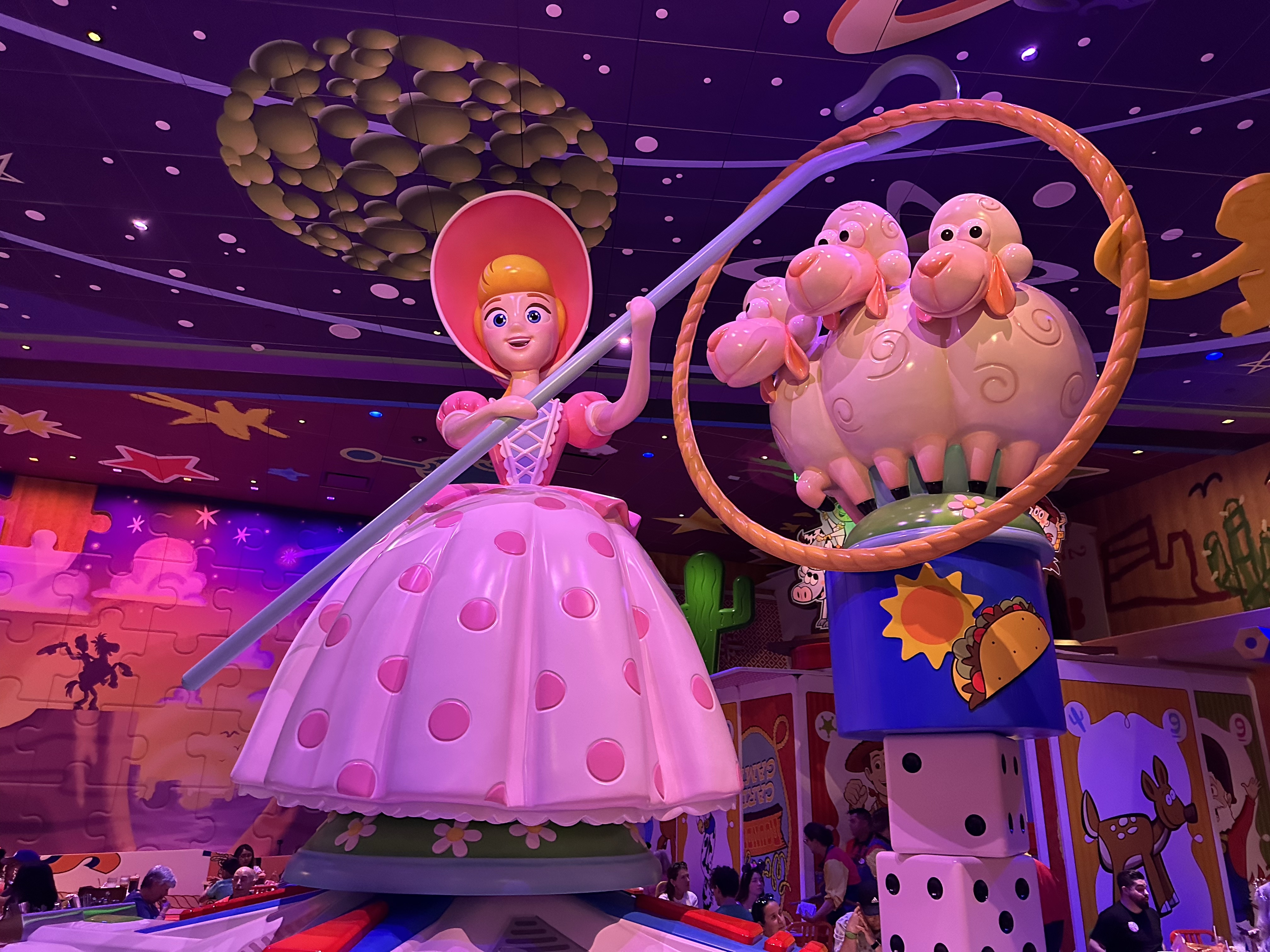 I visited Disney's Hollywood Studios earlier today and had the pleasure of dining at the Roundup Rodeo BBQ, which opened today. From the moment I walked in, I was transported to a magical world of oversized toy decor, reminiscent of my childhood favorites. It was as if I had shrunk down to the size of a toy and found myself in the midst of an enchanting playroom filled with familiar characters and lively colors.