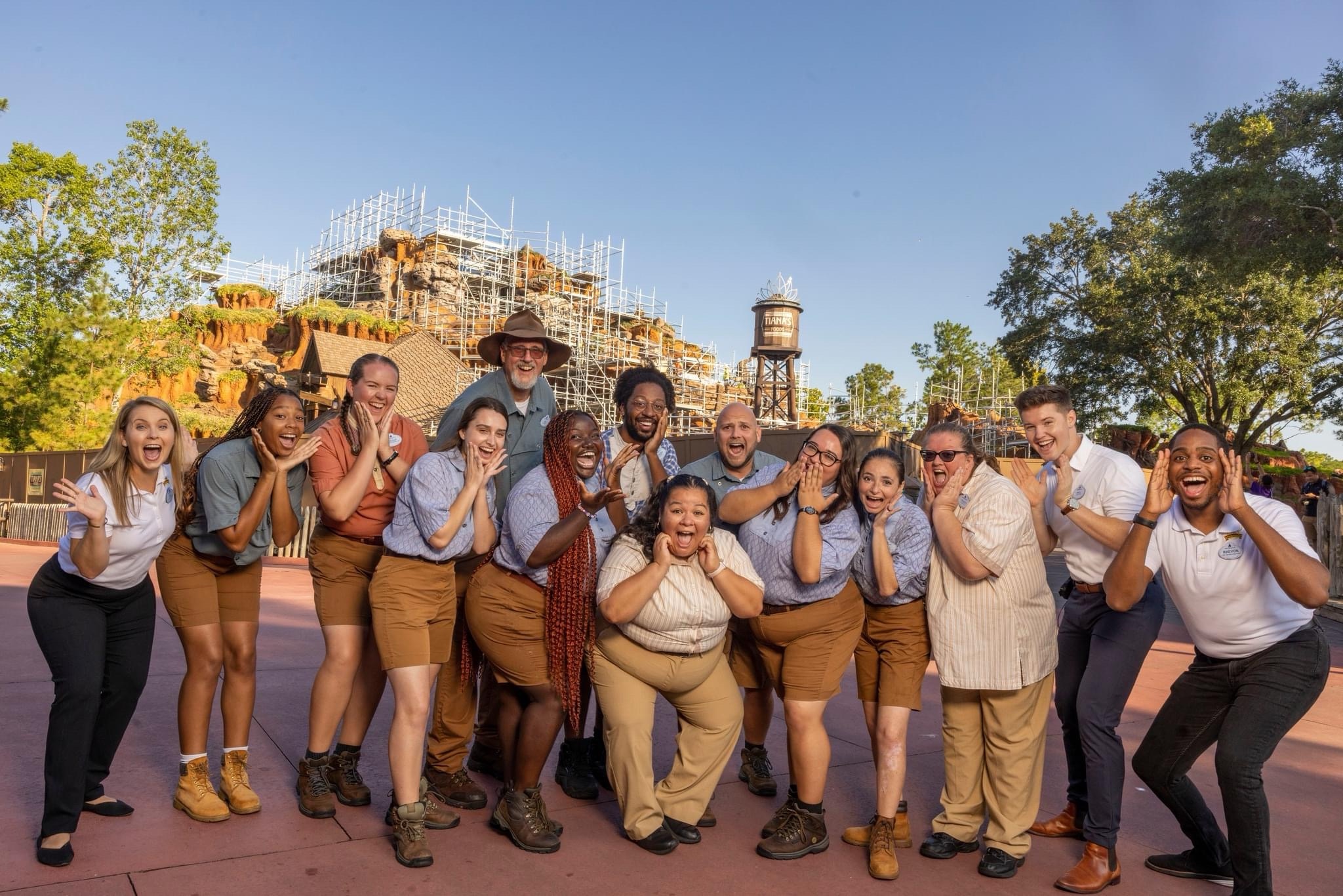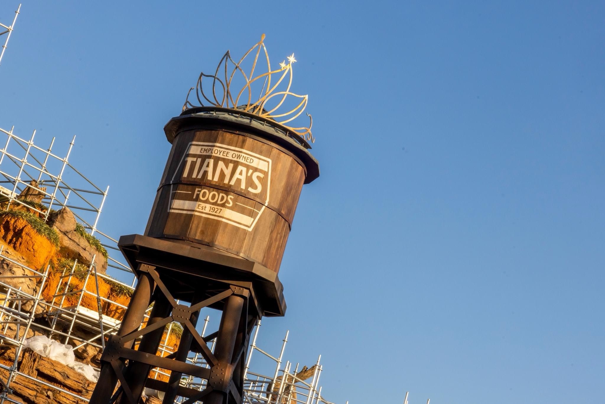 Painted in a rich, dark brown hue, the water tower stands tall, its crown adorned with a resplendent silver decoration that beautifully mirrors Tiana's lilypad-inspired tiara. Adorning the front of the tower, the elegant white Tiana's Foods logo proudly announces its presence. Adding to the excitement, the construction walls surrounding the attraction showcase a vibrant rendition of this logo, beckoning guests to immerse themselves in the forthcoming culinary journey.